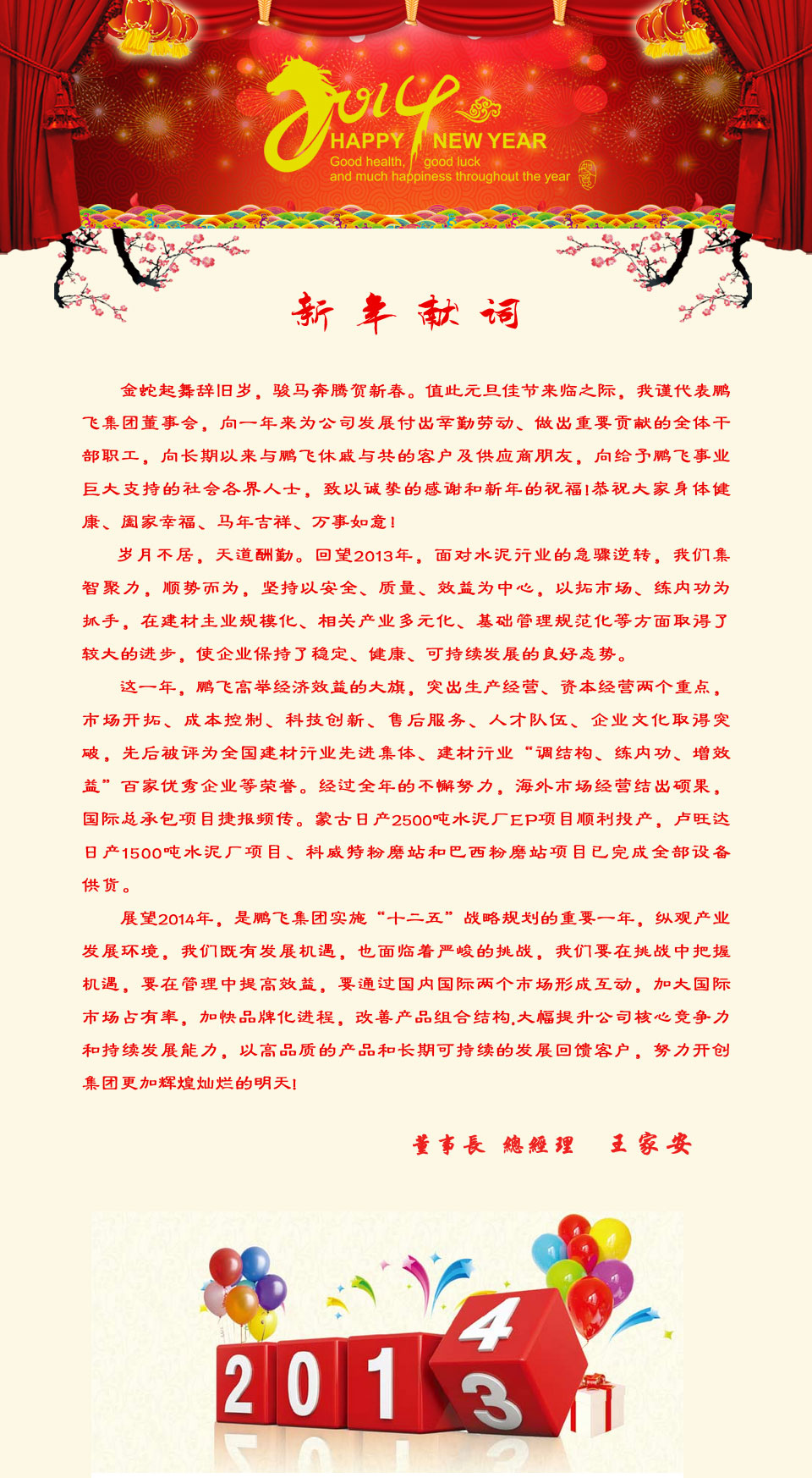 江蘇鵬飛集團(tuán)股份有限公司董事長(zhǎng)、總經(jīng)理2014新年獻(xiàn)詞