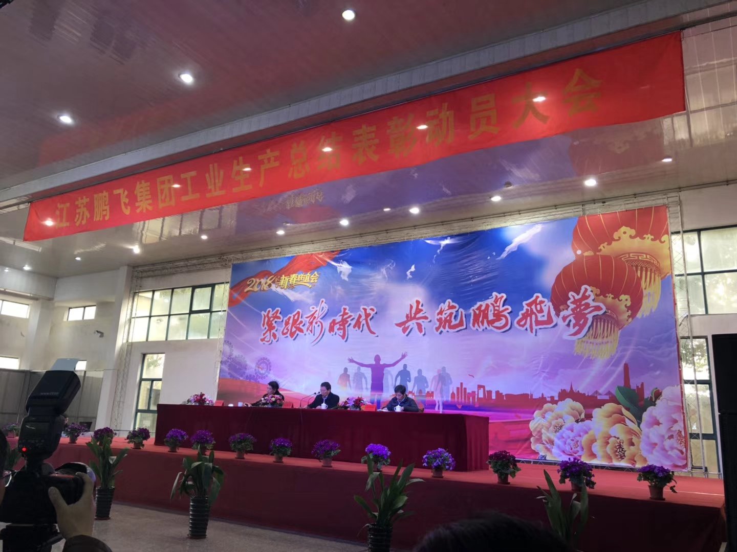 2018年2月20日(農歷正月初五)上午8:08分,江蘇鵬飛集團股份有限公司大禮堂前彩旗招展,鞭炮齊鳴。公司《緊跟新時代 共筑鵬飛夢》主題大會今天在此隆重召開。會上江蘇鵬飛集團股份有限公司董事長王家安先生宣布:
