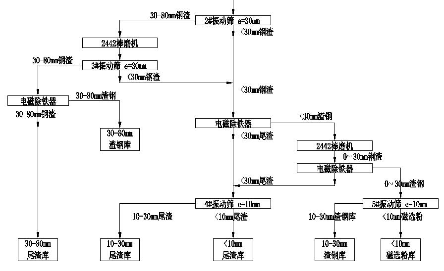 通過(guò)熱悶作業(yè)消除、粉化后的鋼渣,通過(guò)履帶式挖掘機(jī)將熱悶裝置內(nèi)的鋼渣取出放入儲(chǔ)料場(chǎng)儲(chǔ)渣槽里進(jìn)行晾曬和粉化。經(jīng)晾曬和粉化好的鋼渣通過(guò)抓斗起重機(jī)分別抓運(yùn)至儲(chǔ)料場(chǎng)中的液壓傾翻格篩上,大于200mm粒級(jí)的鋼渣落入渣槽由裝載機(jī)運(yùn)至落錘處進(jìn)行處理剝離出渣鋼,用電磁吸盤(pán)將渣鋼吸出,剩余鋼渣返回傾翻格篩進(jìn)入加工生產(chǎn)線。小于200mm粒級(jí)的鋼渣進(jìn)入篩下料倉(cāng),由振動(dòng)給料機(jī)將物料均勻送給1#膠帶輸送機(jī),由1#膠帶機(jī)將鋼渣送入磁選-提純加工線。該轉(zhuǎn)爐鋼渣的磁選-提純加工線的設(shè)計(jì),考慮生產(chǎn)線的機(jī)動(dòng)性,即當(dāng)工藝線設(shè)備檢修時(shí)確保連續(xù)生產(chǎn),本設(shè)計(jì)采用兩條加工線并列生產(chǎn)。每條線均包括有破碎、篩分、磁選、提純加工等工藝環(huán)節(jié)。由1#膠帶機(jī)將物料送入加工線,首先在入線的輸送機(jī)上設(shè)有懸掛有電磁除鐵器,將大渣鋼選出落入渣鋼槽;鋼渣送入1#振動(dòng)篩(e=80mm)進(jìn)行分級(jí)。80mm以上的篩上鋼渣直接進(jìn)入PEY600×900液壓顎式破碎機(jī)進(jìn)行破碎,破碎至80mm以下的鋼渣與篩下的鋼渣一并經(jīng)2#膠帶輸送機(jī)送至2#振動(dòng)篩分級(jí)。2#振動(dòng)篩(e=30mm)篩上物(>30mm的鋼渣)經(jīng)3#膠帶機(jī)和振動(dòng)給料機(jī)送進(jìn)1#棒磨機(jī)進(jìn)行破碎和提純處理,棒磨機(jī)排出后經(jīng)4#、5#膠帶機(jī)送入3#振動(dòng)篩(e=30mm)進(jìn)行分級(jí),>30mm的鋼渣經(jīng)膠帶機(jī)送大渣庫(kù)由磁選機(jī)將渣鋼和尾渣分離開(kāi)來(lái)分別入庫(kù)。2#振動(dòng)篩和3#振動(dòng)篩的篩下物均為<30mm鋼渣,由膠帶機(jī)送入1#單磁選機(jī)將磁性物料分離出來(lái),由膠帶機(jī)送進(jìn)磨頭倉(cāng),由計(jì)量秤、膠帶機(jī)、振動(dòng)給料機(jī)等將磁性物料均勻送入2#棒磨機(jī)進(jìn)行提純處理;經(jīng)2#棒磨機(jī)進(jìn)行提純后的鋼渣由膠帶機(jī)送入2#單磁選機(jī)分離出渣鋼由膠帶機(jī)送入4#振動(dòng)篩(e=10mm)進(jìn)行篩分,根據(jù)產(chǎn)品的不同用途分出渣鋼(10-30mm)和磁選粉(<10mm)分別入庫(kù);經(jīng)1#、2#單磁選機(jī)排出的非磁性物料統(tǒng)稱為尾渣,均由膠帶機(jī)送入5#振動(dòng)篩(e=10mm)進(jìn)行篩分,分級(jí)為>10mm的尾渣和<10mm的尾渣分別進(jìn)入尾渣庫(kù)。